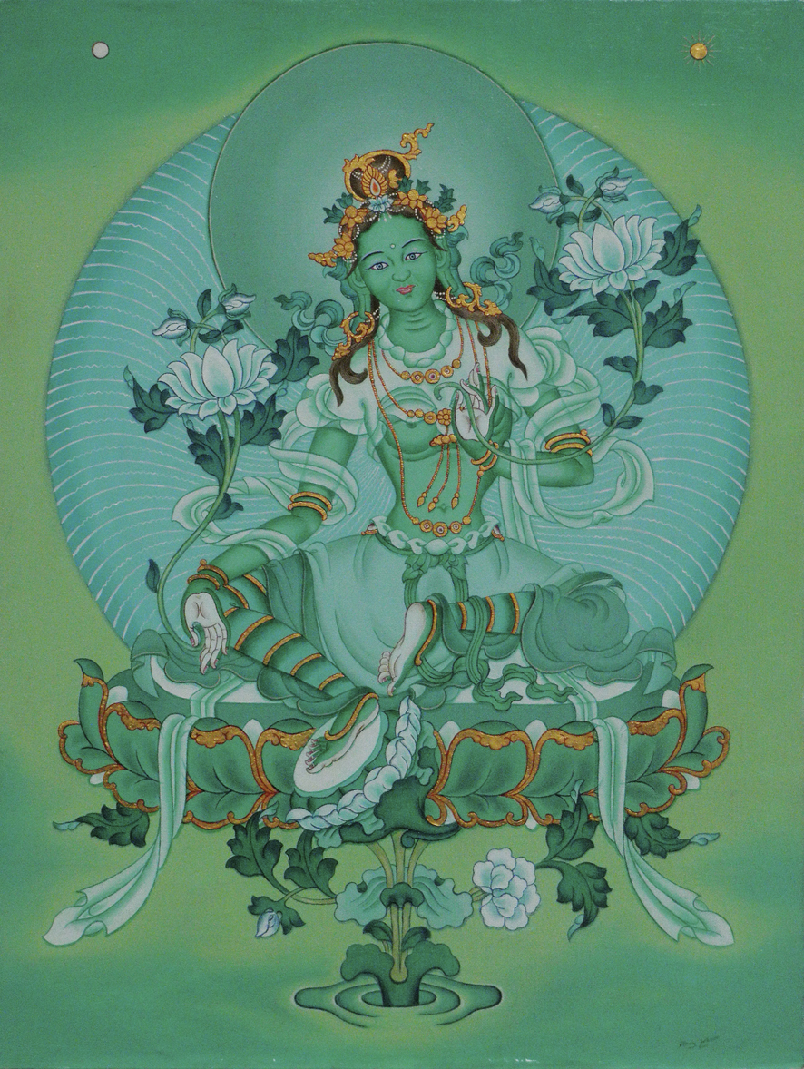 Tara is the most revered Buddha in Tibetan Buddhism. This course will focus on the Female Buddha. Born from a tear of Avalokiteshvara, the Buddha of Compassion, Green Tara grants protection and relief from suffering. Called “the mother of all Buddhas”, she promises assistance when called upon and is seen as the embodiment of active compassion. Her right hand bestows fearlessness while her left hand (in the gesture of supreme enlightenment) holds the Utpala flower representing her knowledge of the three times. The open flower reveals the past, the closed the future and the just opening the present. With devotion to her and doing her practice, both inner and outer obstacles can be overcome. She can be practiced on all different levels of tantra. Students will receive hands-on instruction from the drawing to the painting stages. Saying the mantra of Om Tare Tuttare Ture Soha and meditating on her light has the power to heal the body and mind. Daily meditation and mantra session will make this course very unique and deepen your understanding of Tibetan Buddhism.